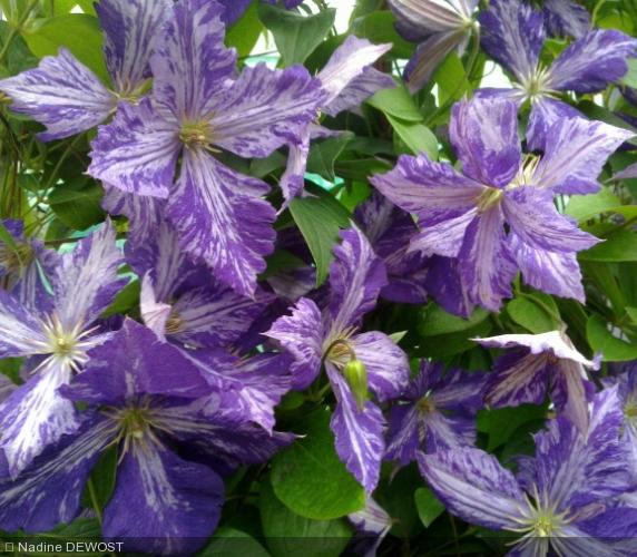 RetourNom commun : ClematiteObtention de Van Laken au Etats Unis en 2000, c'est un sport de Jackmanii à fleurs moyennes bleu violet veiné de blanc et fleurissant tout l'été.
