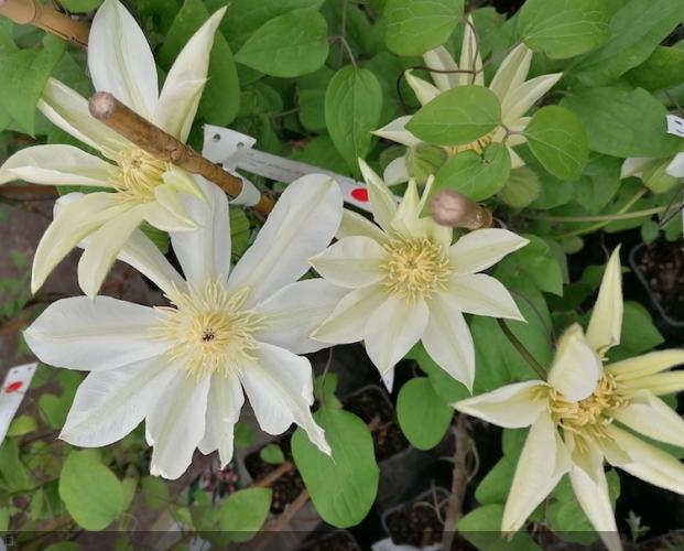 Terrain : pH : Indifférent - Sol : drainant Exposition : Mi-ombre, Rusticité / Climat : Zone : 6 (-22 -17 C) Floraison : OuiCouleurs : blanc crème Parfum : Oui C'est une sélecion de C.patens. Plante de 2m50 de hauteur aux grandes fleurs de 15-18 cm de diamètre avec 6-8 tépales avec des étamines jaunes, qui préfère une exposition mombre. Elle se taille en juni après la floraison. |