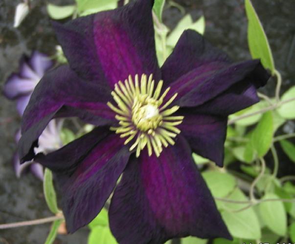 Fleur moyenne de 10 cm de diamètre avec 4 tépales bien séparés pourpre fonçé velouté.les étamines sont jaunes.